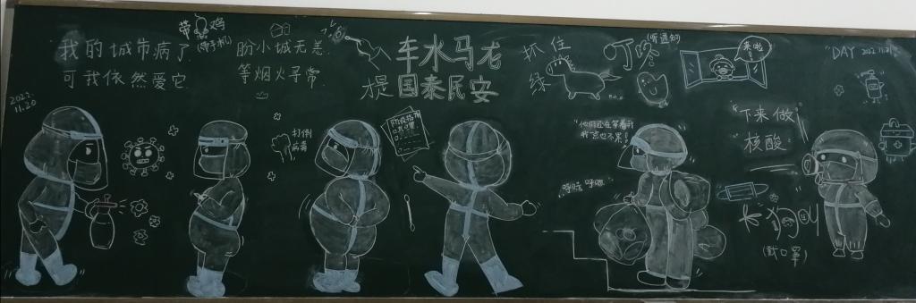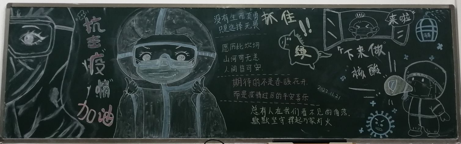 李倩同学是临床医学院一名22级的新生,也是一名校内的防疫志愿者,负责在核酸采集点测量体温,当看到《致重庆市民的一封信》,更加坚定了她“用行动守好家”的决心。轮班休息中的她在黑板上画下了志愿服务里“一个个忙碌的身影,一幅幅感人的画面”,“身边很多同学都主动参与到学校的志愿服务中,虽然工作很累,但是没有一个人想过退出,我想用画笔记录下这一个个温暖的瞬间,定格这一段难忘的‘战疫’记忆。”