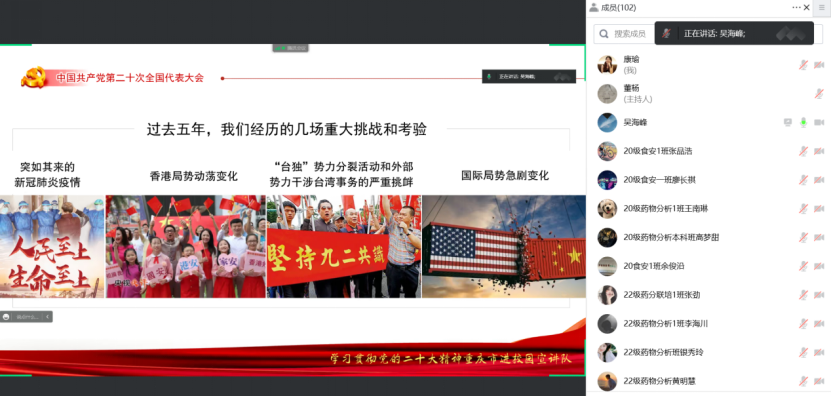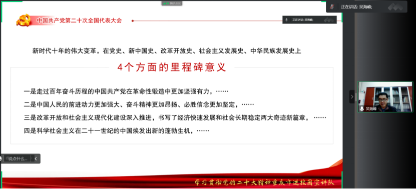 11月24日晚,学校党委书记吴海峰通过腾讯会议云端为我校本科班学生宣讲党的二十大精神。