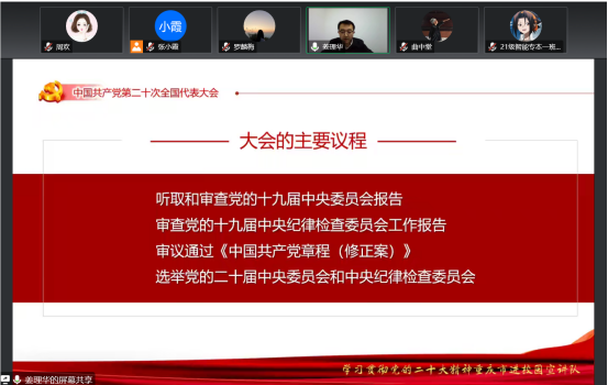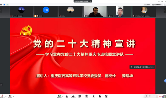 为学习宣传贯彻党的二十大精神,切实落实党的二十大精神进校园,在学校党委的统一部署下,12月1日,学校党委委员、副校长姜理华通过腾讯会议为基础部(医工学院)全体教职工和20级专本班学生开展了党的二十大精神宣讲活动,参加此次宣讲会的共计120余人。