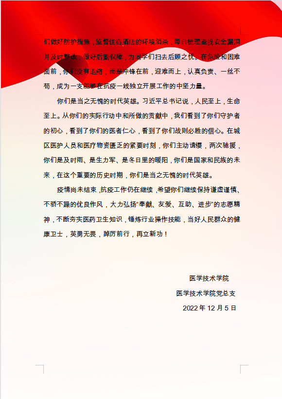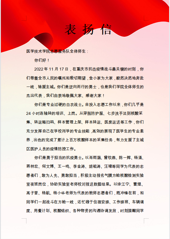 医学技术学院留校值守的老师们给志愿服务队师生准备了鲜花并以学院的名义专门撰写表扬信,表扬他们在志愿工作当中所做出的贡献。