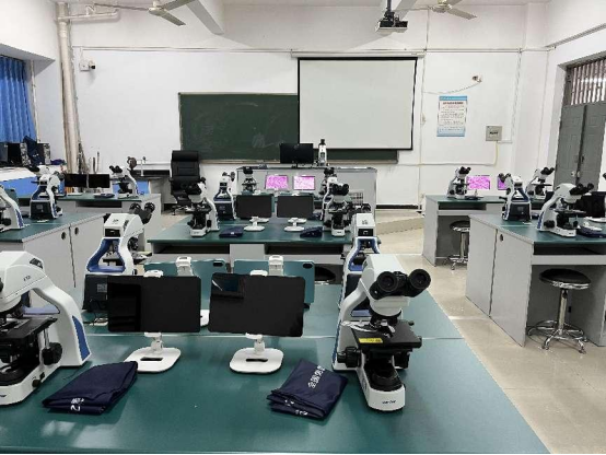 基础部在现有数码显微互动实训室的基础上,新建1间无线智能数码显微互动实验室,有教师端数码显微镜1台、学生端数码显微镜30台。本实训室具备5G WiFi全无线架构,学生端使用手机或平板电脑扫描二维码即可自行安装App软件,多平台支持,同时支持Android/IOS/Windows系统。通过手机/平板/电脑各种终端即可实现实验互动教学。