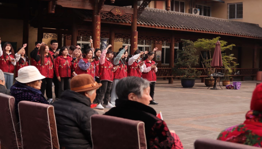在慢城谦和养老院,志愿者们为老人们测量血压,普及用药知识;陪老人聊天,为他们按摩;与老人一同唱歌、打太极拳,并和老人们一起做手工,合影留念。