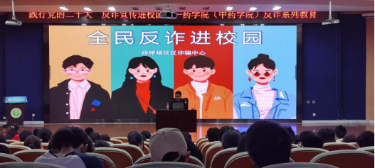 3月16日,为积极响应党的号召,贯彻落实党的二十大精神,准确把握其丰富内涵和精神实质,进一步提高同学们的防范反诈意识和自我保护意识,持续开展宣传防范电信网络反诈犯罪,切实维护大学生的经济利益。药学院(中药学院)联合保卫处于学校图书馆学术报告厅组织开展了“践行党的二十大 反诈宣传进校园”反诈系列教育活动,邀请陈家桥派出所警长罗彬为师生做讲座,陈家桥警官王军、药学院(中药学院)党总支副书记杨宗发、部分辅导员合计200余人参加了此次讲座,学院党总支专职副书记薛惠元担任主持。