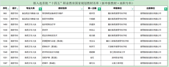 5月8日,教育部职业教育与成人教育司公示拟入选首批“十四五”职业教育国家规划教材名单,学校主持并编写的《常用制药设备使用与维护》《医药市场营销》《临床药物治疗学》《药剂学》《药品生物检定技术》《药物化学》《药事管理与法规》等10部拟入选首批“十四五”职业教育国家规划教材。其中我校第一主编占5部,第二主编占1部,参编4部。
