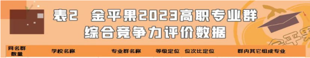据悉,金平果2023高职专业评价以教育部《职业教育专业目录(2021年)》为依据,按照“十四五”国家经济社会发展和2035年远景目标对职业教育的要求,按照专业大类、专业类和专业三级分类评价。数据包括全国1484所高职院校19个专业大类、96个专业类、734个专业、246个专业群和1064个群内专业的综合实力分布情况。专业评价指标分为三级,其中一级指标包括师资队伍、平台基地、教学水平、科研产出和声誉影响五个方面,二级指标包括专任教师、教学团队、资源库建设、教研基地、人才培养、教学成果、学生竞赛、教改试点等19个方面,三级指标包括教指委、行指委、就指委、人才计划、名师先进、创新团队、实训基地、教学成果、技能大赛、教学竞赛、教改试点、产教融合、创新创业、双高建设、办学历史、1+X证书、现代学徒制试点等44个方面,涉及100多个数据观测点。