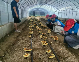 图为志愿者参观学习石坪村校企合作项目药材基地灵芝园