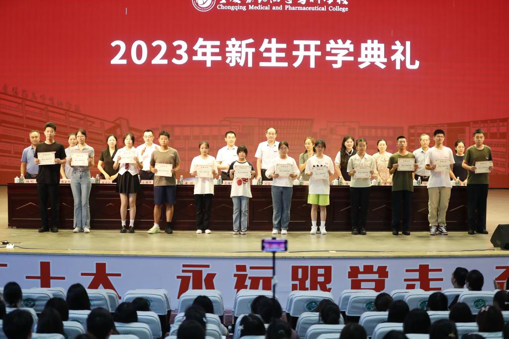 何坪在开学典礼上宣读了《关于发放2023年新生奖学金的决定》,参会领导向新生奖学金获得者颁奖。