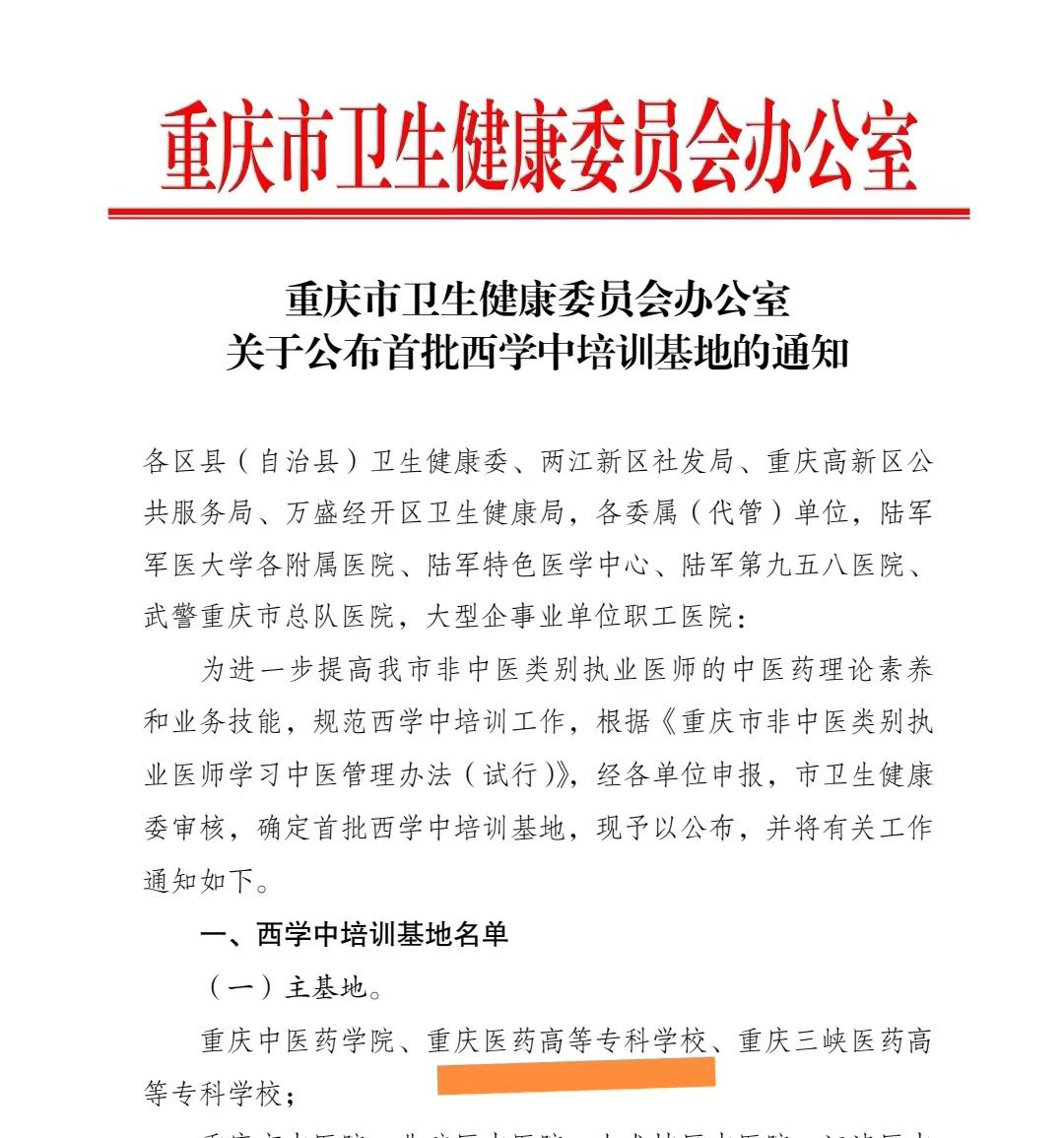 11月27日,重庆市卫生健康委员会公布了全市首批西学中培训基地。在学校支持下,副校长何坪牵头继续教育学院、中医学院和相关区县级中医院,经积极申报,市卫生健康委审核,成功推动我校获批全市首批西学中培训主基地。此举将进一步提升学校社会服务能力,推动我校非学历继续教育办学水平高质量发展,为进一步提高我市非中医类别执业医师的中医药理论素养和业务技能助力。