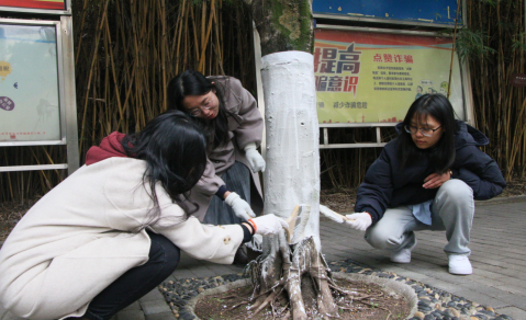 活动中,志愿者们戴上手套,拿着桶、石灰、刷子等工具,六人一组,手持毛刷,石灰水溅到身上,也丝毫没有影响大家的劳动热情。在刷树过程中,志愿者们做到树干粉刷高度一致、刷涂均匀,既起到了防虫害作用,又达到了美化环境的效果。经过大家一下午的忙碌,保质保量地完成了树木的粉刷任务,为学生社区道路两旁树木都穿上了白色的“新衣”,更显“精神”。