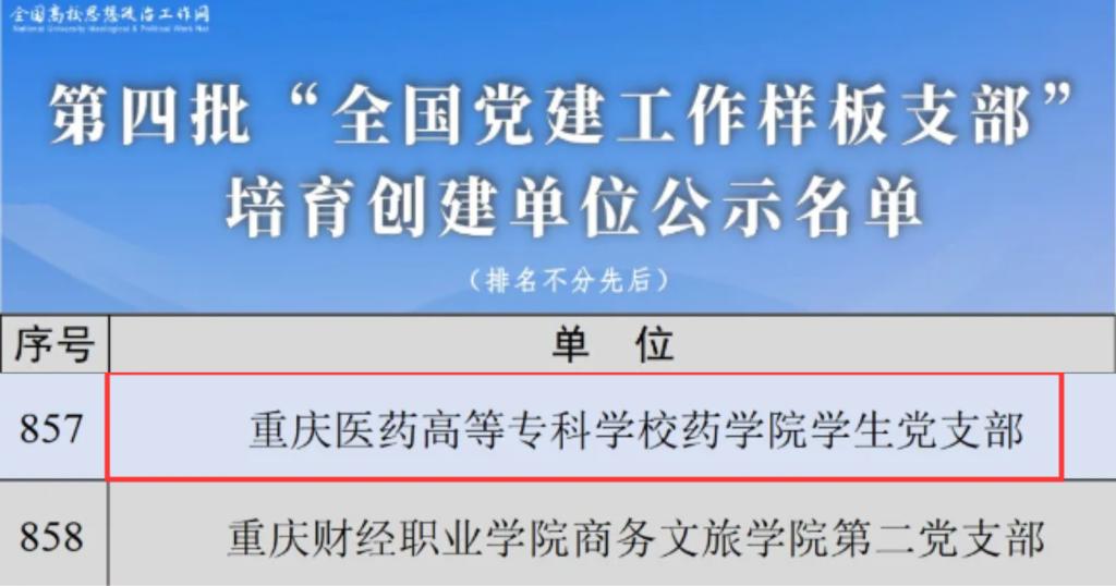 近日,教育部思想政治工作司公布了第四批新时代高校党建示范创建和质量创优工作遴选结果,我校药学院学生党支部成功入选第四批“全国党建工作样板支部”培育创建单位。这是我校获批首个“全国党建工作样板支部”,是学校在党建领域取得的重大突破。