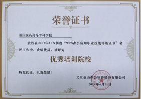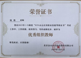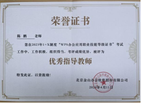 北京金山办公软件股份有限公司在2023年举办了WPS办公应用职业技能等级证书评优活动,鼓励先进、树立榜样,对在2023年度试点工作中做出杰出贡献的组织与个人予以表彰。我校荣获2023年度“优秀培训院校”称号。何艳、陈鹏两位教师在2023年1+X制度“WPS办公应用职业技能等级证书”考试工作中,工作积极,组织得当,考评成绩优异,分别被评为“优秀组织教师”和“优秀指导教师”。