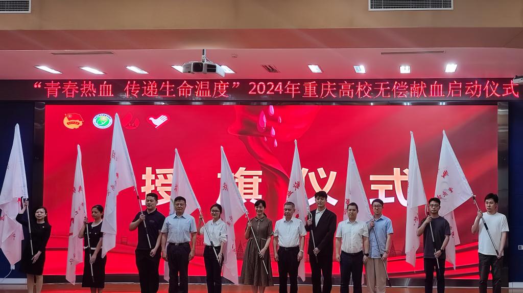 活动现场,学校青年大学生志愿者代表以“以青春之名,赴热血之约”为主题,发出无偿献血志愿服务倡议书。与会领导为9所高校代表授予重庆市无偿献血志愿服务分队旗帜,动员各高校团委要坚持以志愿服务为牵引,继续在引领青年思想进步中发挥先导性、示范性作用,组织发动广大青年大学生率先参与无偿献血,为树立社会新风尚作表率,助力推动《献血法》落地落实。