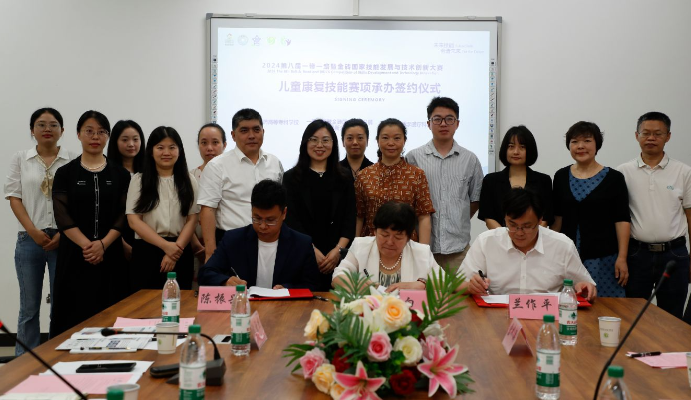 随后,兰作平与白丽、陈振兴共同签署了《2024一带一路暨金砖国家技能发展与技术创新大赛儿童康复技能赛项承办合作协议》。本次签约仪式的圆满成功,标志着2024年第八届一带一路暨金砖国家技能发展与技术创新大赛“儿童康复技能”赛项的筹备工作正式拉开序幕。相信在各方共同努力下,本次大赛必将取得圆满成功,为全球儿童康复技能的发展和创新贡献力量。