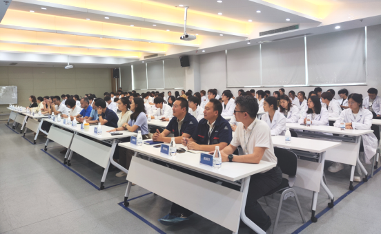 高开显向在场的老师和同学介绍了企业历程、战略、运营、产品及愿景,其中特别强调了“人才”在企业发展各个环节中的重要性。彭坤分别从政策、行业发展、专业基础三个层面提出对现场工程师项目的展望,寄语同学们努力学习为体外诊断领域的发展添砖加瓦。医学技术学院陈源源和基础部(医工学院)邓文宇两位同学代表所有现场工程师学徒从学习态度和职业素养两方面做出郑重承诺。