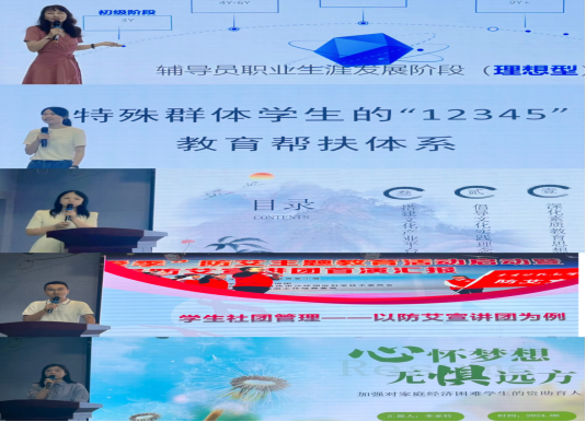 五位辅导员结合个人经历分享了学生工作中的收获和感悟,共话成长,互鉴前行。护理学院郭娇就职业发展的初级、中级和高级三个阶段对辅导员职业生涯规划进行分享;沙坪坝校区谢丽萍通过具体案例对特殊群体学生的帮扶体系进行详细阐述;中医学院王惠介绍了辅导员工作室模式促进高等教育的文化“育人”工作;医技学院曾小飞以防艾宣讲团为例介绍了学生社团管理的经验和成效;沙校区李亚铃就资助育人工作让大家更深层次了解“扶困更要扶志”的工作理念。
