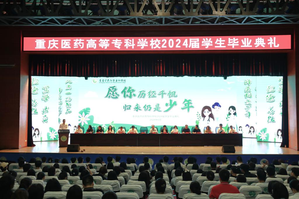 毕业典礼开始前,全体师生共同观看毕业专题片《愿你历尽千帆,归来仍是少年》,该片以学生视角回顾了2024届学生在医高专三年的学习时光与生活日常,展现了他们的成长与变化。随后,姜理华宣布毕业典礼正式开始,全体师生起立奏唱国歌。