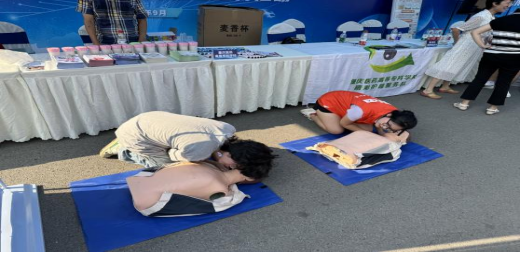 尽管当天下午室外气温逼近40度,活动现场的人们却洋溢着浓厚的热情。市民和师生们积极参与,互动热烈。学校急救科普志愿服务队开展了“以心护心、保卫心脏”为主题的急救科普活动,用生动形象的语言,结合实际操作,通过现场演练指导,让每一位参与者在实践中学到宝贵急救技能。同时,学校急救科普志愿服务队还针对高血压、冠心病、心肌梗死等常见心脑血管疾病的预防、处理和康复进行了深入浅出的科普宣教,充分展现了急救科普的专业性和实用性。