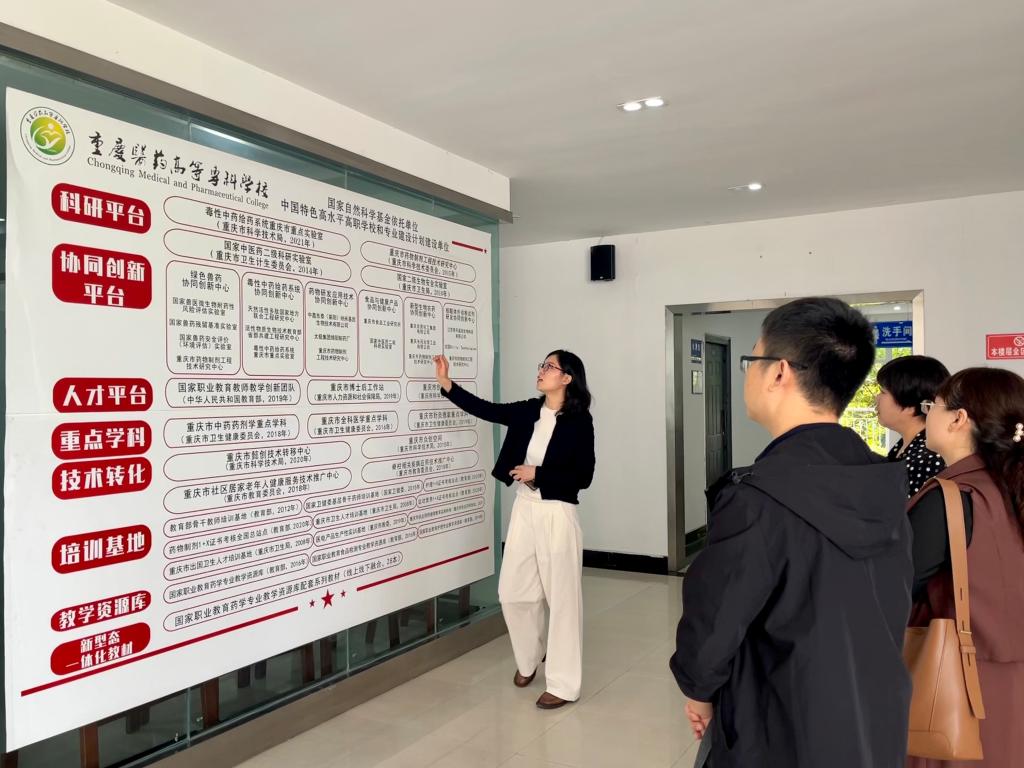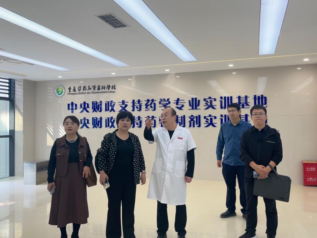 首先,武彩霞一行前往药学院(中药学院)专业实训基地进行实地参观考察,深入了解国家级生产性实训基地模拟GMP实训药厂、国家级虚拟仿真教学平台、重庆市药物制剂工程技术研究中心、学校中药标本馆等学生实训平台的建设和使用情况。