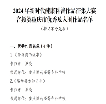 近日,“健康知识普及行动—2024年新时代健康科普作品征集大赛(重庆赛区)”圆满落幕,我校马克思主义学院教师罗唤的2项参赛作品经过市级初审、专家组评审和社会公示,在多轮激烈角逐中脱颖而出,被评为大赛优秀作品并由市卫健委将推荐上报至国家卫健委参加全国评选。