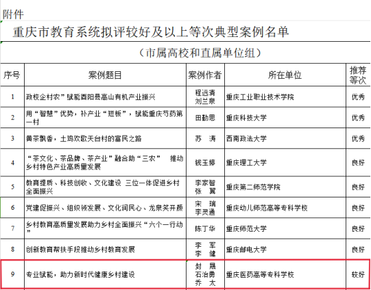 近日,经专家网络评审、综合评议等环节,我校推送的乡村振兴案例从全市164个典型案例中脱颖而出,成功入选重庆市教育系统精准帮扶典型案例。