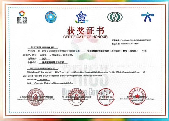 12月1日,学校临床医学专业老挝留学生在一带一路暨金砖国家技能发展与技能创新大赛—首届健康照护职业技能(老年方向)比赛中斩获佳绩。