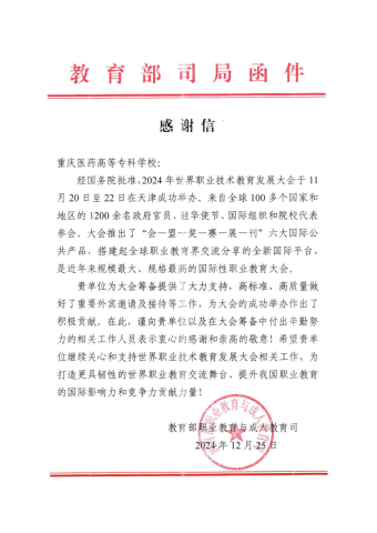 近日,我校收到教育部职业教育与成人教育司感谢信,表彰我校在2024年世界职业技术教育发展大会作出的积极贡献。