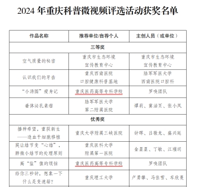 近日,2024年重庆科普微视频评选活动获奖名单正式公布,由我校选送的马克思主义学院教师罗唤团队主创的两项科普微视频作品经形式审查、网络投票、专家评审、社会公示,获得了三等奖和优秀奖