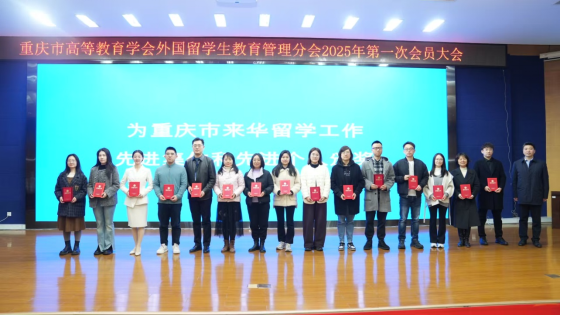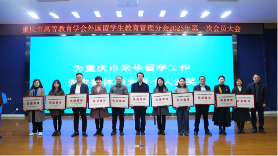 会议还宣读了《关于表彰2024年重庆市来华留学工作先进集体和先进个人的决定》,并对获奖集体和个人进行了颁奖。这一环节不仅表彰了在来华留学工作中表现突出的单位和个人,也激励了全体会员在新的一年里再接再厉,为重庆市来华留学事业做出更大贡献。我校获2024年重庆市来华留学工作先进集体,王爽、谭苏莹分别获2024年重庆市来华留学工作年度人物和先进个人。
