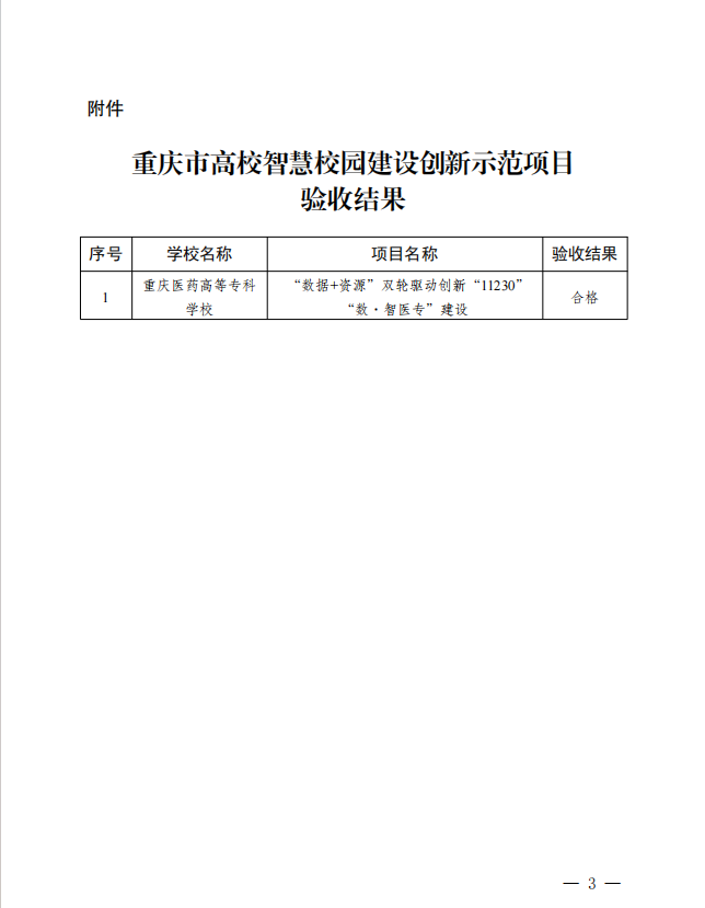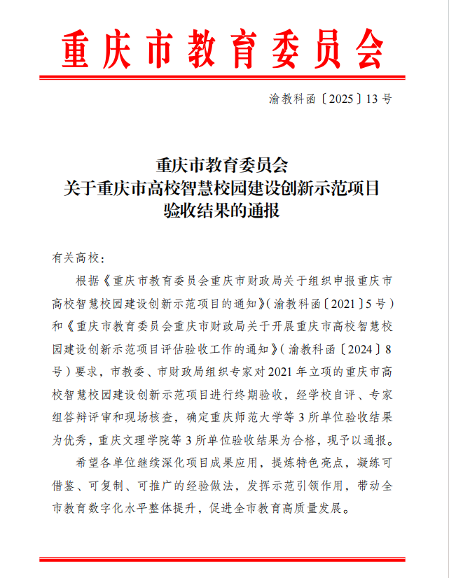 2021年7月16日,重庆市教育委员会重庆市财政局发布《关于公布重庆市高校智慧校园建设创新示范项目立项名单的通知》,因我校申报项目成功立项,并获得智慧校园创新示范项目奖补资金500.00万元。