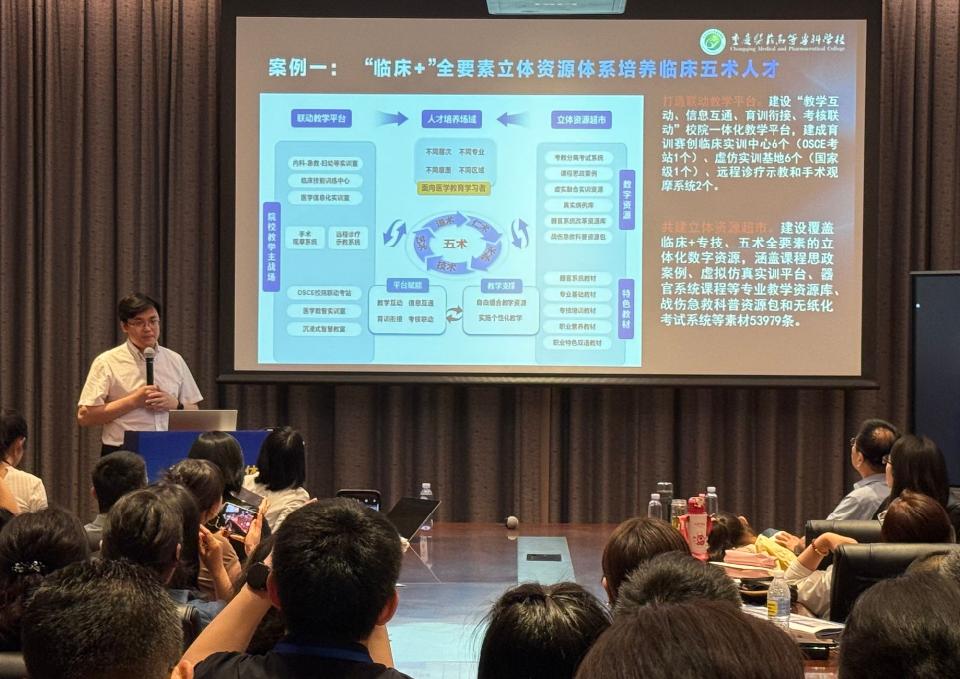 6月7日下午,在形态学+产教共同体分会场上,兰作平作了题为《医教融合数字赋能——学校数字化转型实践与探索》的主题报告,详细阐述了学校在数字化转型方面的成功经验与创新成果。报告聚焦于学校的“数・智医专”建设,通过构建一套基础环境和一个安防体系,以双轮驱动实现三网融合,进而打造数字生态圈的举措和成效。兰作平介绍了学校在数智赋能下打造“金课程”“金教材”“金基地”等一系列数・智资源高地建设方面的显著成效,并强调通过提升教师信息化素养,推动信息技术与教育教学的深度融合,实现了教学质量的显著提高和专业建设的持续提质。兰作平的报告引起了与会者的强烈共鸣,为其他院校提供了宝贵的借鉴经验。