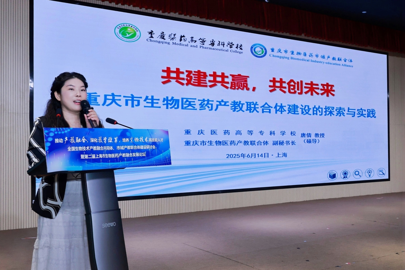 学校药学院(中药学院)副院长,重庆市生物医药市域产教联合体副秘书长唐倩教授作为嘉宾,受邀在产教融合共同体与联合体建设经验分享环节分享我校在产教联合体建设方面的宝贵实践经验。唐倩从联合体的筹备目标设定与政策依据、主体确认与牵头单位选定、联合体的申报与评审、建设实施核心环节以及长效运行等方面进行了全面分享,得到了现场的一致好评,为全国职业院校深化产教融合提供了重要参考。