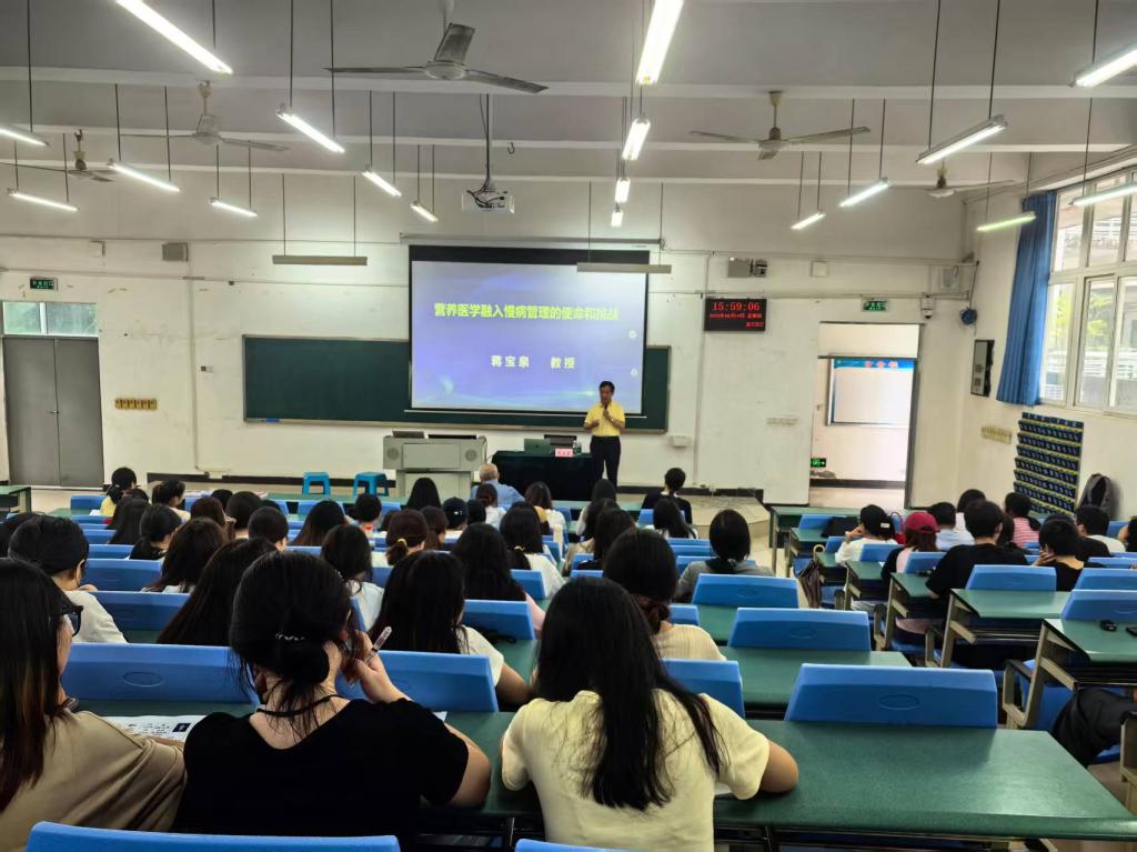 讲座特邀重庆市渝北区人民医院营养科主任蒋宝泉作为主讲嘉宾。蒋宝泉以其深厚的专业知识和丰富的临床经验,为同学们带来了一场内容详实、见解深刻的报告。讲座聚焦四大核心维度:合理营养与健康管理、慢病现状与营养医学机遇和挑战、住院患者的合理营养以及老年人群营养问题等。通过多维度剖析,蒋宝泉不仅呈现了行业前沿动态,更强调了预防医学与营养专业人才在推动慢病防控中的使命担当与职业前景。