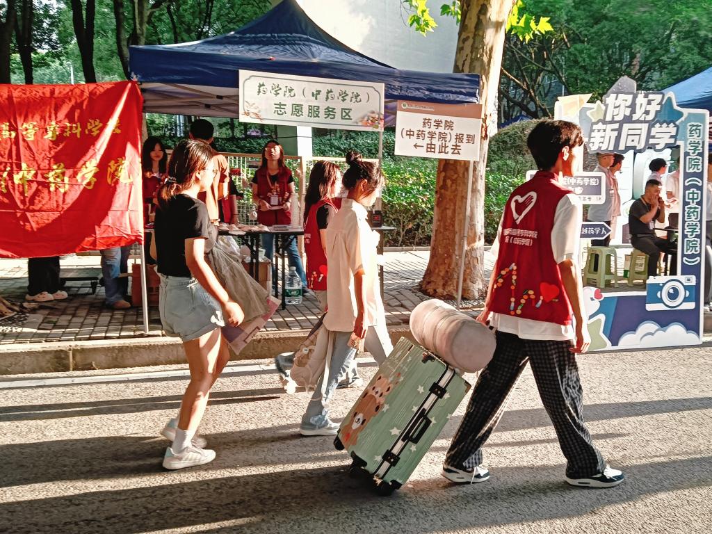 9月11日至12日迎新现场,各工作组协同发力,用贴心服务驱散新生初入校园的陌生感。在林荫大道的志愿服务区,志愿者们顶着烈日主动上前接过新生行李,“同学,这边请,我带您去报到”“家长累了吧,先到休息区喝杯中药特色茶饮吧”等暖心话语不绝于耳。