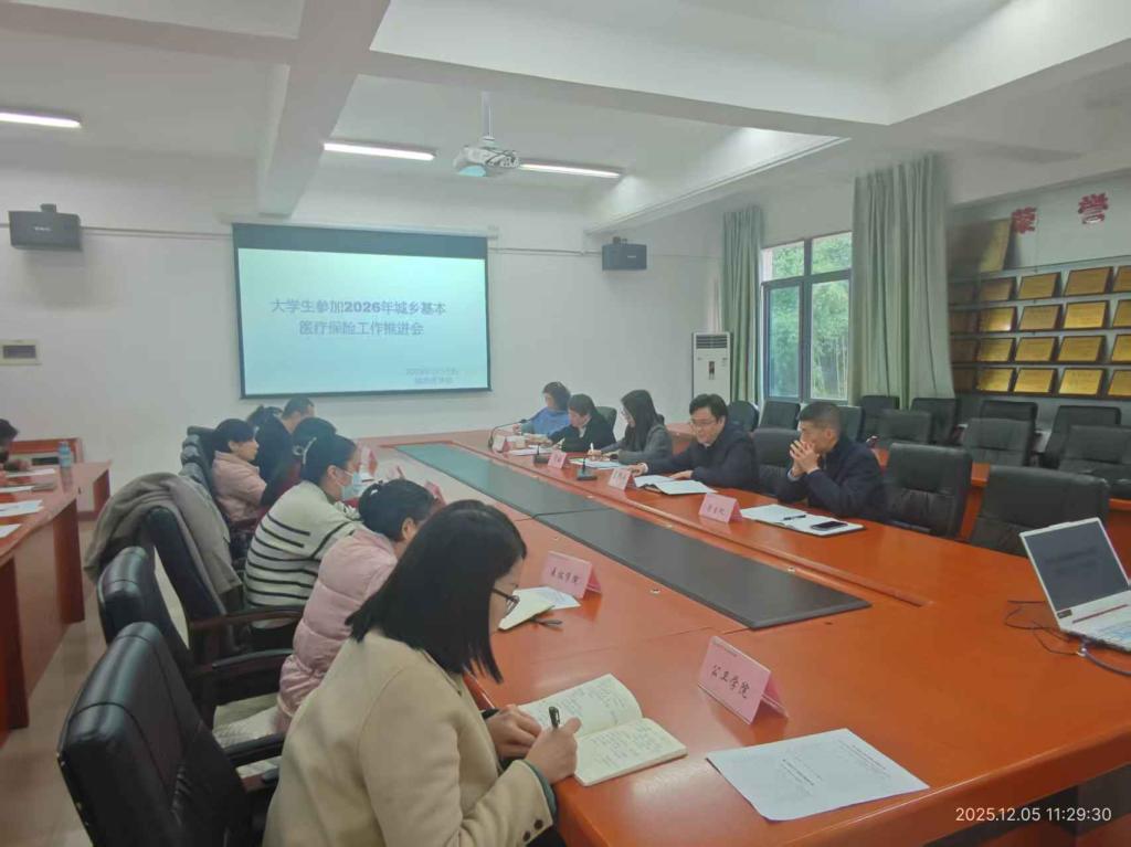 为深入贯彻落实国家关于大学生参加城乡居民基本医疗保险的决策部署,切实做好2026年度大学生参保工作,提升学生健康保障水平,学校于12月5日组织召开了大学生参加城乡居民医保工作推进会。会议由临床医学院牵头,副校长兰作平、各学院学生工作负责人及医保工作经办人应邀出席。