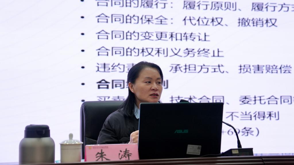 朱涛教授结合《民法典》及相关法律法规,立足高校工作实际,系统阐述了合同全生命周期及其规范体系、合同管理总体要求及全流程风险管控等核心内容,深刻剖析了高校合同管理中的常见风险类型,提出了积极针对性的风险防范措施与管理建议。