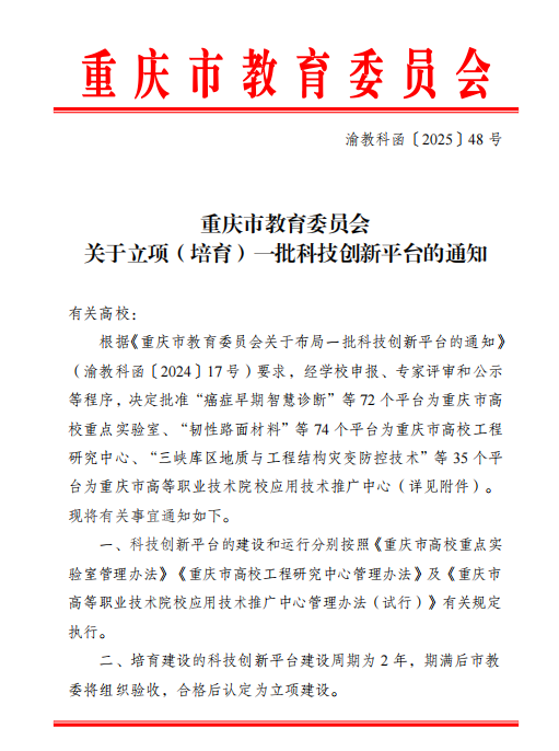 近日,重庆市教育委员会发布《关于立项(培育)一批科技创新平台的通知》,学校组织申报的同一健康新药创制工程研究中心、重庆市职业病康复实用应用技术推广中心两个科技创新平台成功获批立项(培育)。此次获批不仅是对学校科研实力、学科建设水平及服务区域发展能力的充分肯定,也将进一步推动学校服务重庆区域医药健康产业发展的科技创新能力迈上新台阶。