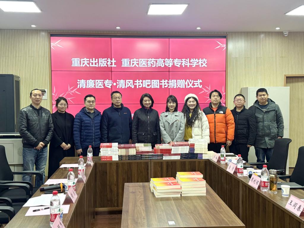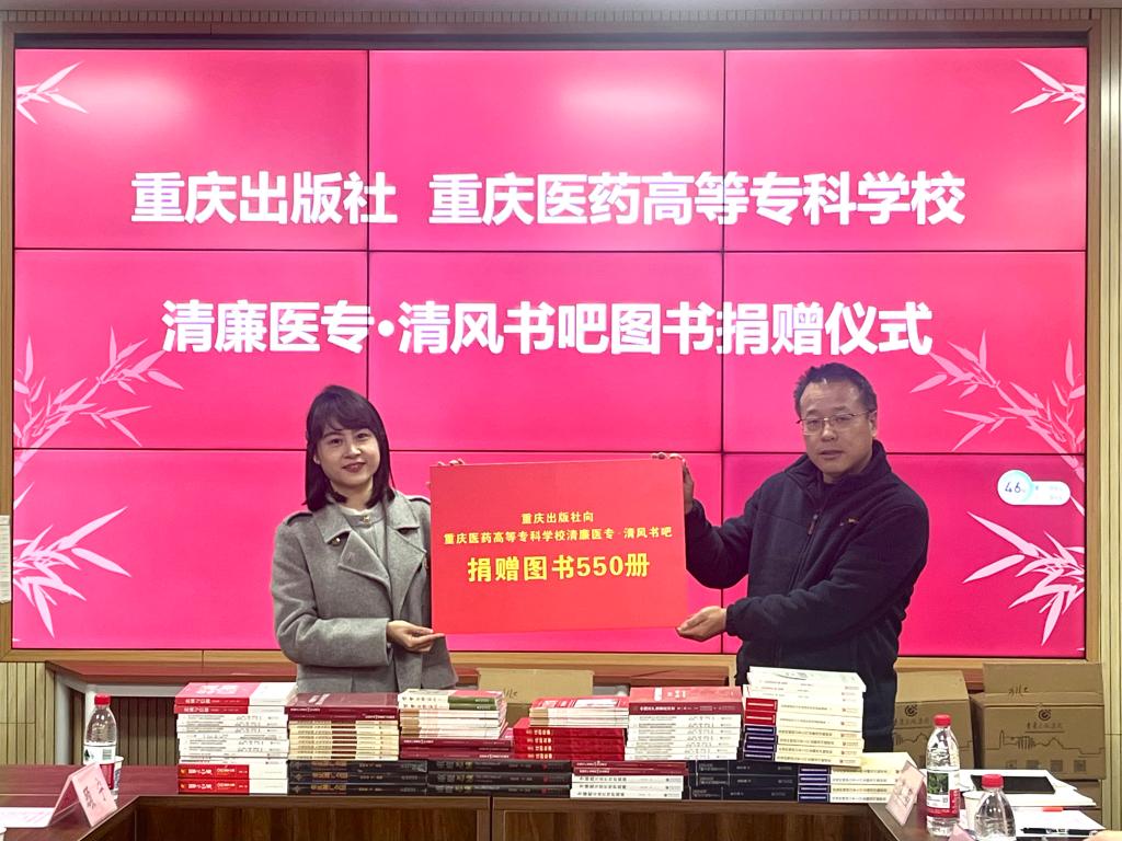 1月6日下午,澳门电子pg游戏官网“清廉医专·清风书吧”图书捐赠仪式在学校3号实训楼3210举行。重庆出版社党群人力资源一部副部长黄乐一行5人,学校党委委员、纪委书记周刘丽,纪委副书记王阗春,以及药学院(中药学院)党政领导、教师代表参加活动。活动由唐倩主持。