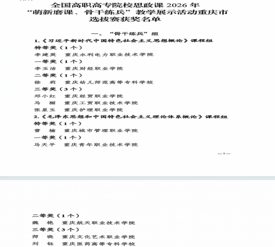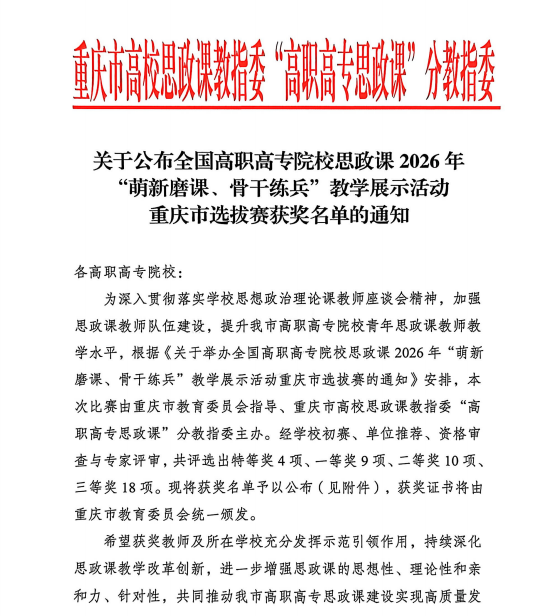 近日,由重庆市教委指导、重庆市高校思政课教指委“高职高专思政课”分教指委主办的2026年全国“萌新磨课、骨干练兵”教学展示活动重庆市选拔赛公布评选结果,学校马克思主义学院教师刘钰获得三等奖。