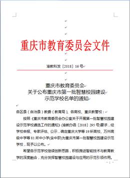 近日,据《重庆市教育委员会关于公布重庆市第一批智慧校园建设示范学校名单的通知》,我校成功申报重庆市第一批智慧校园建设示范学校。