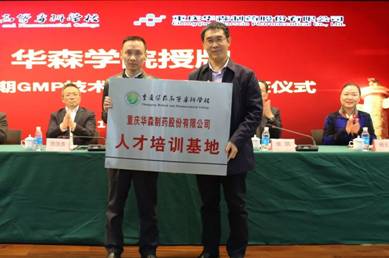 学校党委书记吴海峰和华森制药股份有限公司质量总监陈劲揭牌“人才培训基地”