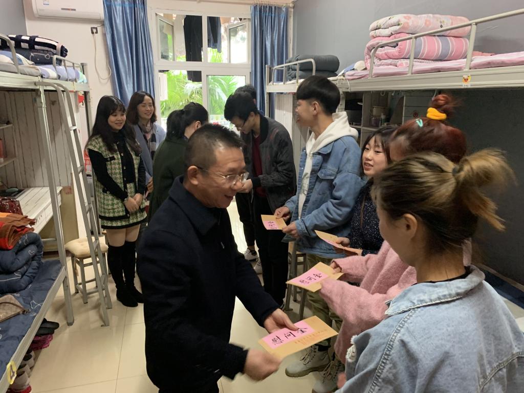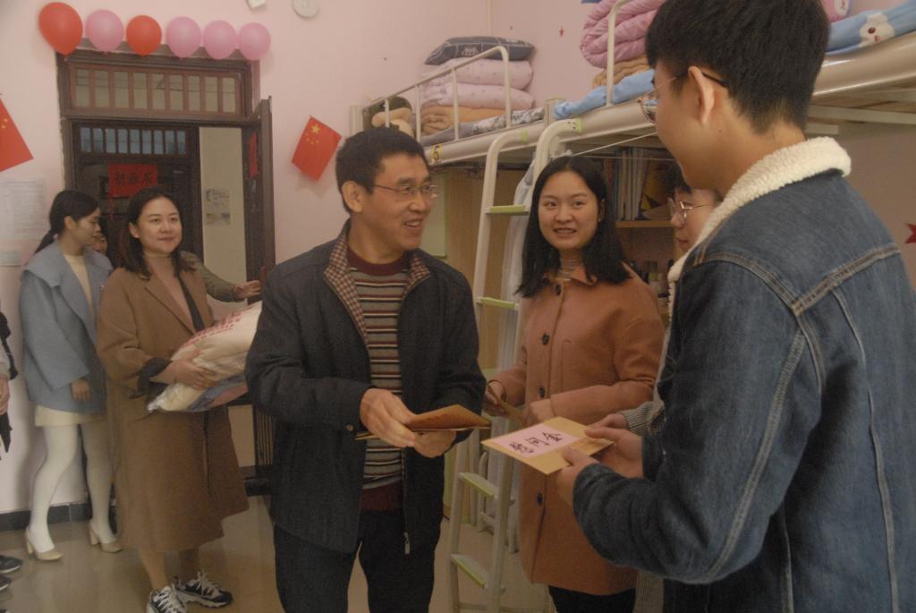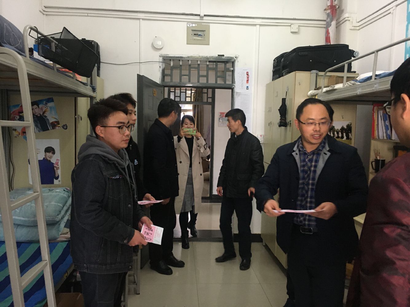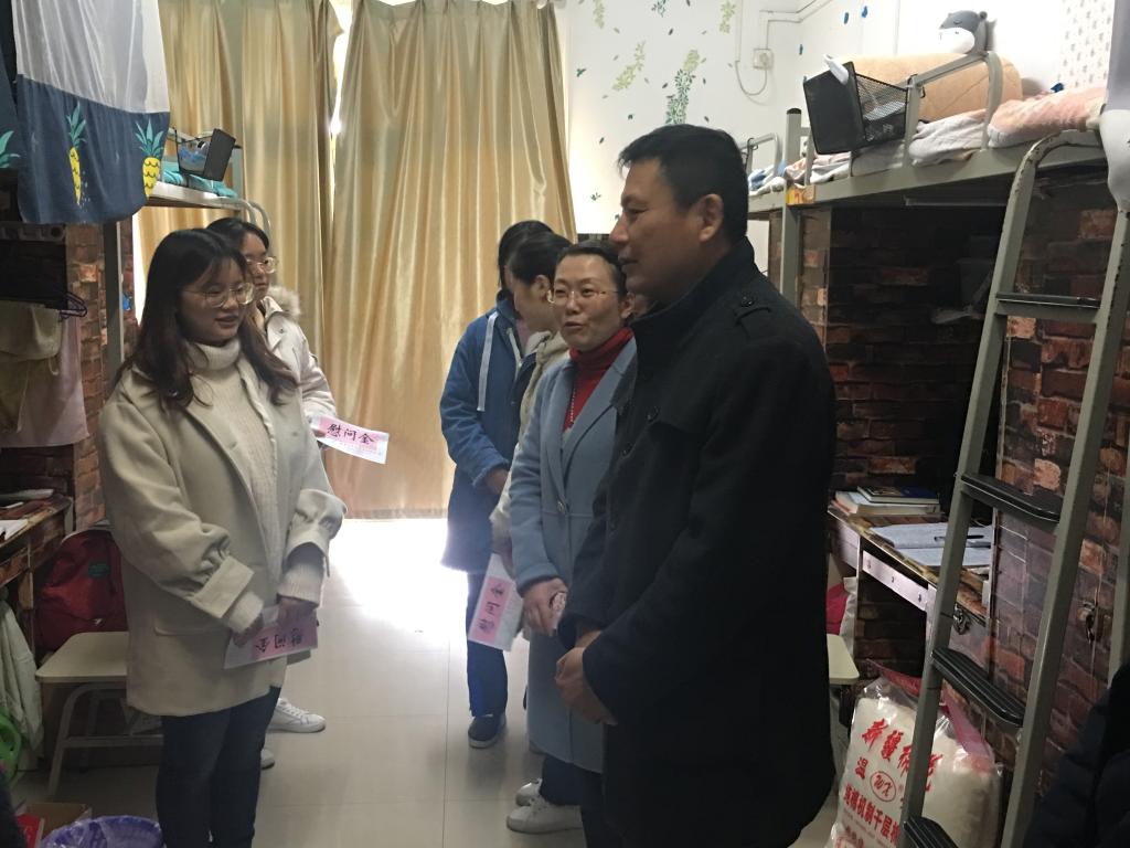校领导们在学生寝室,或站着与大家亲切交谈,或坐着与同学们倾心交流,在与同学们的交谈中,学校领导十分关注和关心同学们的生活以及学习的近况,多次提及到热水使用、食堂饭菜价格以及品质等生活细节,并叮嘱外地的同学寒假返家要特别注意安全。