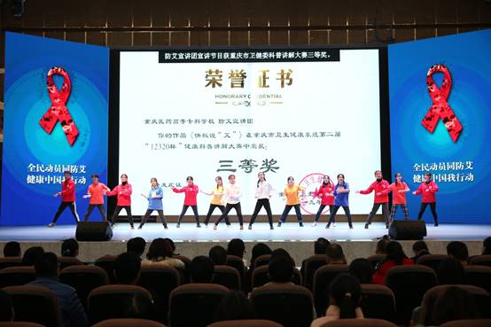 启动仪式上,我校上台领取了重庆市第四届青年爱不艾高校社团参与艾滋病防治工作项目评选第二名证书;学校防艾宣讲团宣教节目《防艾阵线大联盟》作为四个展演节目之一在启动仪式上进行了展演;防艾宣讲团指导教师封晟作为优秀指导教师代表接受主持人采访并向与会领导和同学分享了学校开展防艾教育的具体做法。
