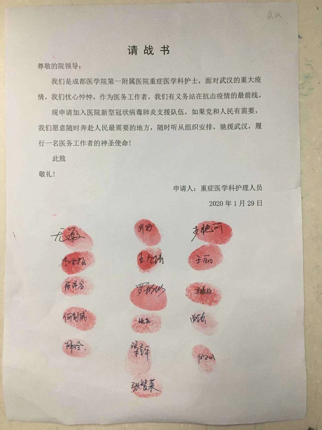 “……面对武汉的重大疫情,我们忧心忡忡,作为医务工作者,我们有义务站在抗击疫情的最前线。现申请加入医院新型冠状病毒感染肺炎救治志愿队伍,听从组织安排,驰援武汉,随时奔赴人民最需要的地方,履行一名医务工作者的神圣使命……”,这是成都医学院第一附属医院重症医学科护理人员写给院领导的请战书,上面印着16个鲜红的指印,而排在第一个的叫做尤敏,她是护理学院2016届涉外护理专业的毕业生,也是成都医学院第一附属医院重症医学科里一名年轻的90后护士。