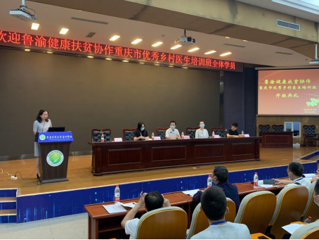 7月12日上午,2020年鲁渝健康扶贫协作重庆市优秀乡村医生培训开班典礼在我校图书馆六楼学术报告厅举行。此次培训由山东省卫生健康委、重庆市卫生健康委主办,我校承办,来自重庆市14个国家级深度贫困区县的共计100名优秀乡村医生参加了此次集中培训。学校副校长朱照静、重庆市卫生健康委基层卫生处副处长侯莹、继续教育学院副院长何静、临床医学院副院长谭丽及相关同志出席了此次开班典礼。