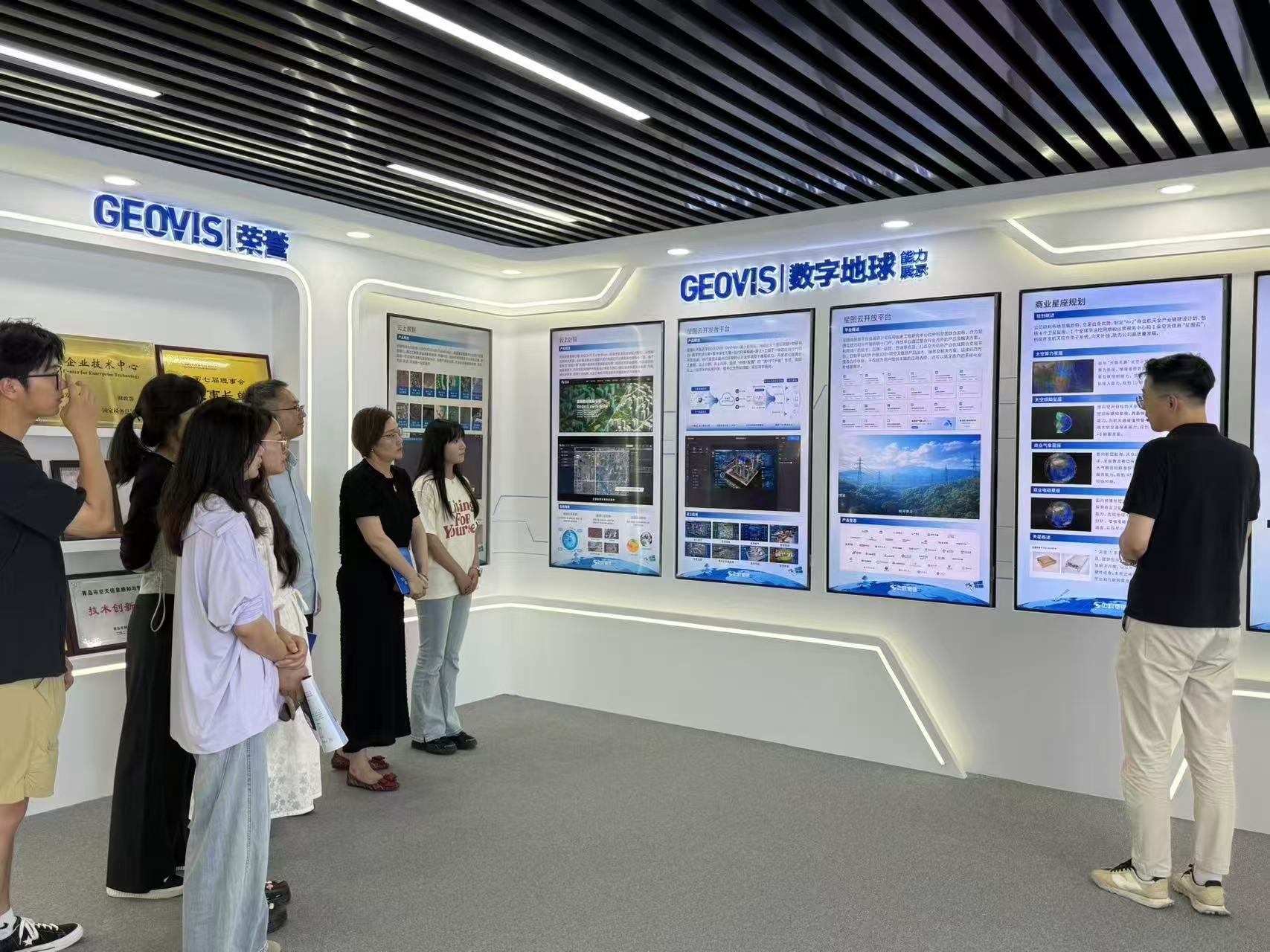 在中科星图相关负责人的陪同下,学院一行人参观了企业的GEOVIS 数字地球体验中心、研发中心。据介绍,中科星图作为国内空天大数据与数字地球领域的领军企业,依托 “GEOVIS 数字地球” 平台,在卫星遥感应用、地理信息系统(GIS)、人工智能与大数据分析等领域形成了核心技术体系,其产品已广泛应用于自然资源监测、应急管理、智慧城市等多个国家战略领域。
