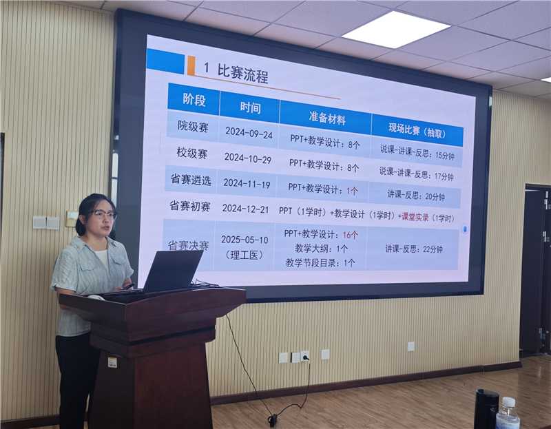 接着,杨广蕾进行了题为“青教赛赛制讲解及备赛技巧”的培训报告会。杨老师结合自身参赛经验和体会,详细给老师们讲解了赛制特点、参赛资料准备事项及参赛技巧。