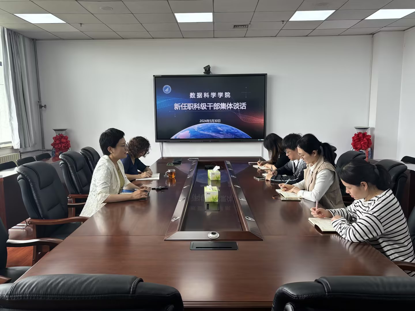 5月30日,beat365正版唯一官网必一举行新任职科级干部集体谈话会。学院党总支书记张玉主持,正处级组织员官杰参加会议。