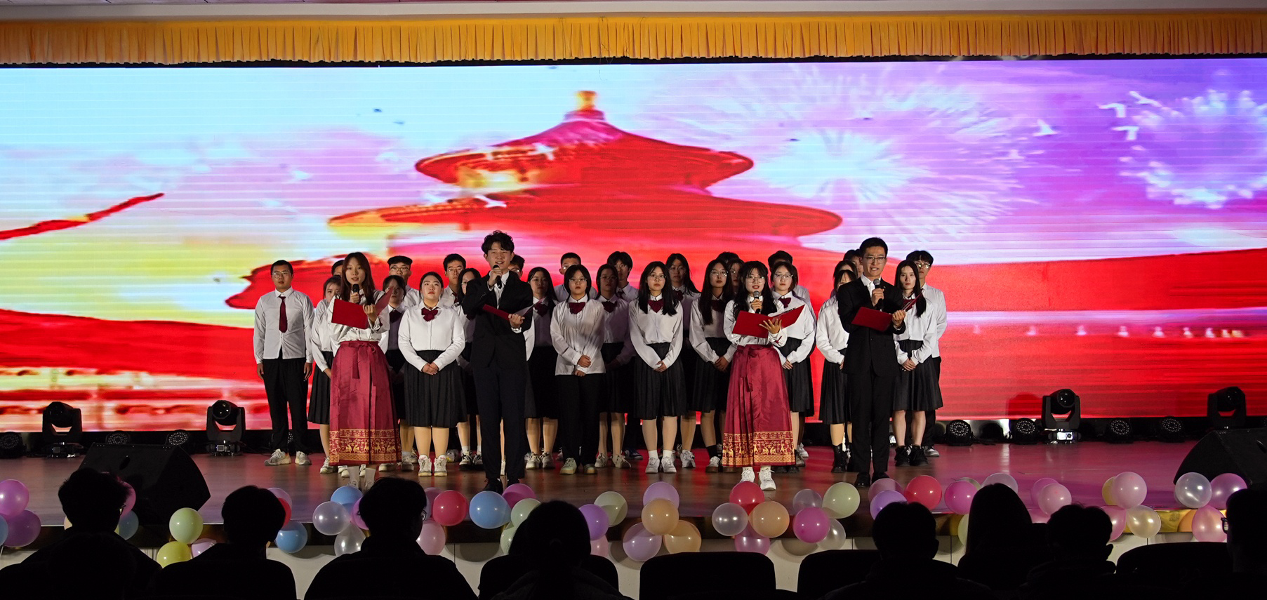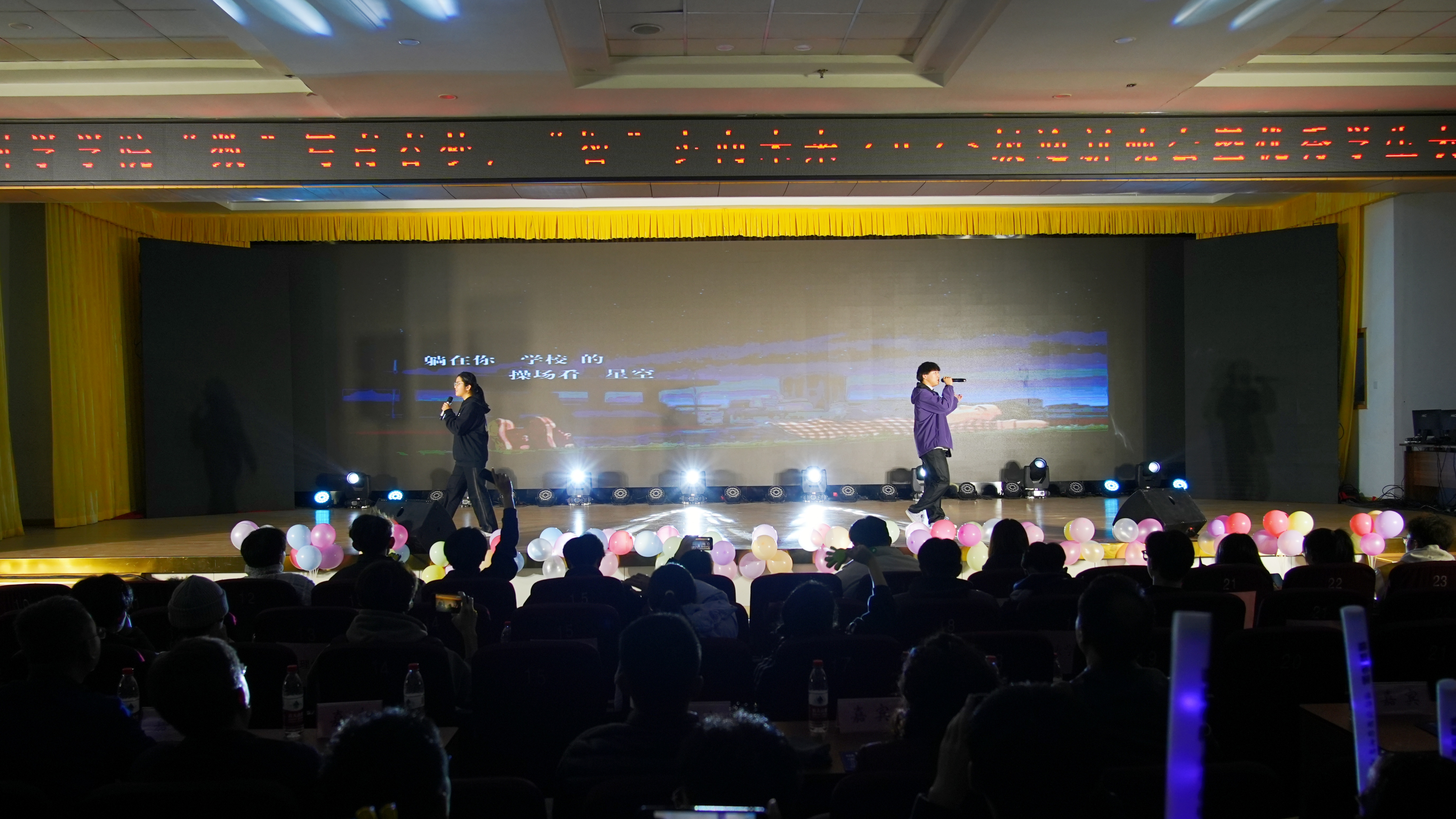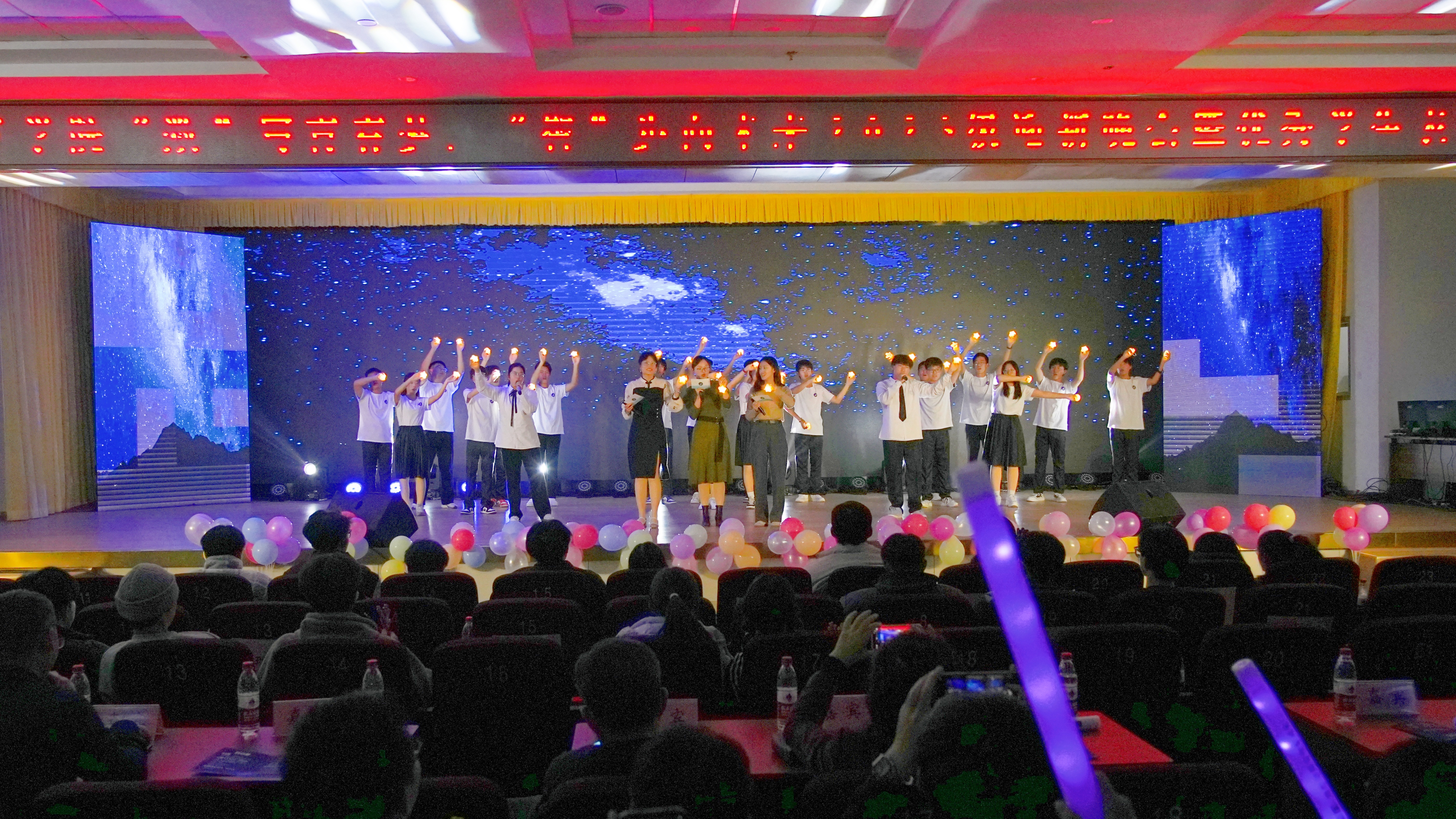 随着全场倒计时的结束,晚会在开场歌舞《奔跑的青春》中正式拉开帷幕。整场晚会分为《芳华待灼,砥砺深耕》《追光而行,循光而立》《以我青春,解码未来》三个篇章,包含歌曲、舞蹈、话剧、朗诵等12个精彩纷呈的节目。晚会现场氛围热烈,节目各具特色,观众们掌声不断。为了增添晚会趣味性,现场还设置了抽奖环节,在场观众积极参与其中,共同抽取一、二、三等奖。