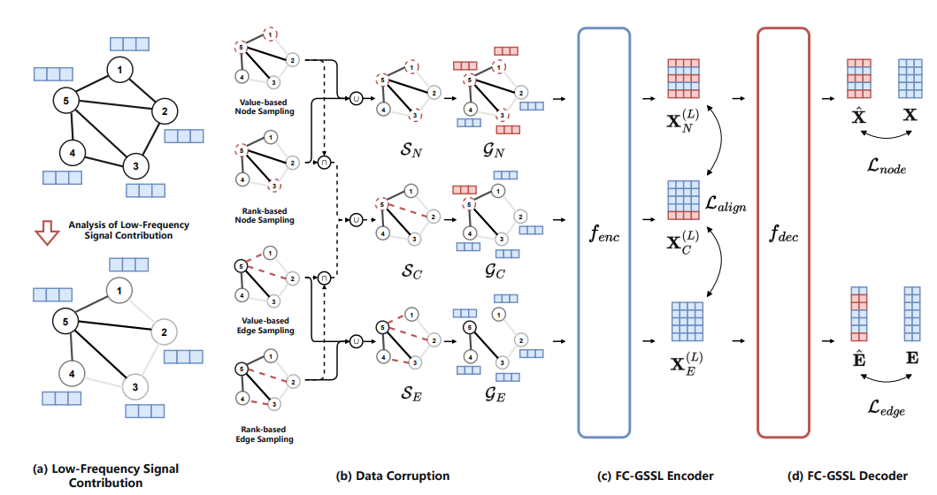 图自监督学习(GSSL)在无需人工标注的情况下缓解了图数据标签稀缺的问题,使其在推荐系统、社交网络分析等领域得到广泛应用。高频信号在GSSL中具有重要价值,能够捕捉局部结构偏好,从而丰富图表示并提升模型性能。然而在实际应用中,两个关键问题阻碍了这些信号的高效与稳健利用:第一,高频信号的局部性限制了模型对其的充分利用;第二,对特定高频信号的过度依赖会影响模型的泛化能力。为解决上述问题,论文提出基于频率扰动的图自监督学习算法(FC-GSSL)。该方法根据节点与边的低频贡献对其进行扰动,生成偏向高频信号的扰动图,并将其输入自编码器,以低频特征与通用特征作为监督信号。这种方法迫使模型有效融合高频与低频信号,从而整合并利用更多有价值的高频信息。此外,论文设计了多种采样策略,并根据不同策略所得结果的交集与并集构建多样化的扰动图。通过对齐来自这些视角的节点表示,模型能够识别出有价值的频率组合,有助于减少特定高频成分的负面影响,并提升泛化能力。FC-GSSL 优化了面向网络应用的图自监督学习设计,在社交网络、引文网络等复杂网络相关图数据上显著提升了模型性能。