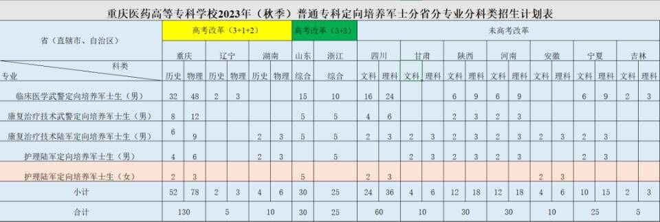 学校2023年定向培养军士招生计划370名,其中与中国人民武装警察部队联合培养临床医学专业招生计划200名,康复治疗技术专业招生计划50名;与中国人民解放军陆军联合培养护理专业招生计划60名,康复治疗技术专业招生计划60名。具体分省分专业分科类招生计划见下表: